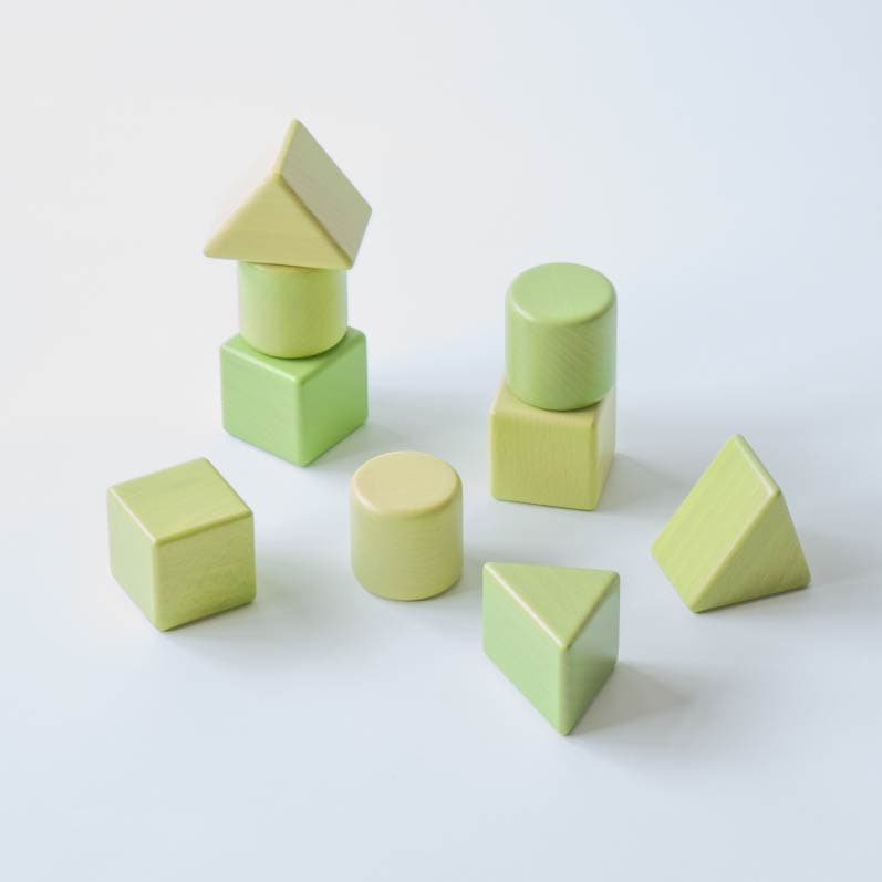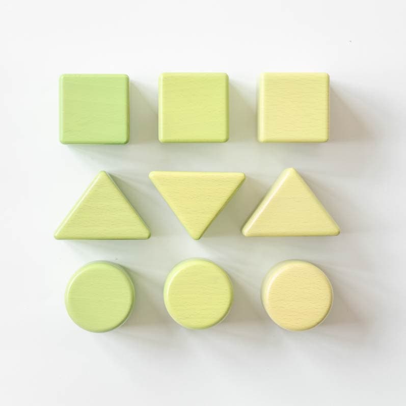 赤ちゃんの手になじむ、優しい手触りの基本の木製積み木です。若葉や新緑をイメージしたさわやかな黄緑グラデーションカラーのセットです。