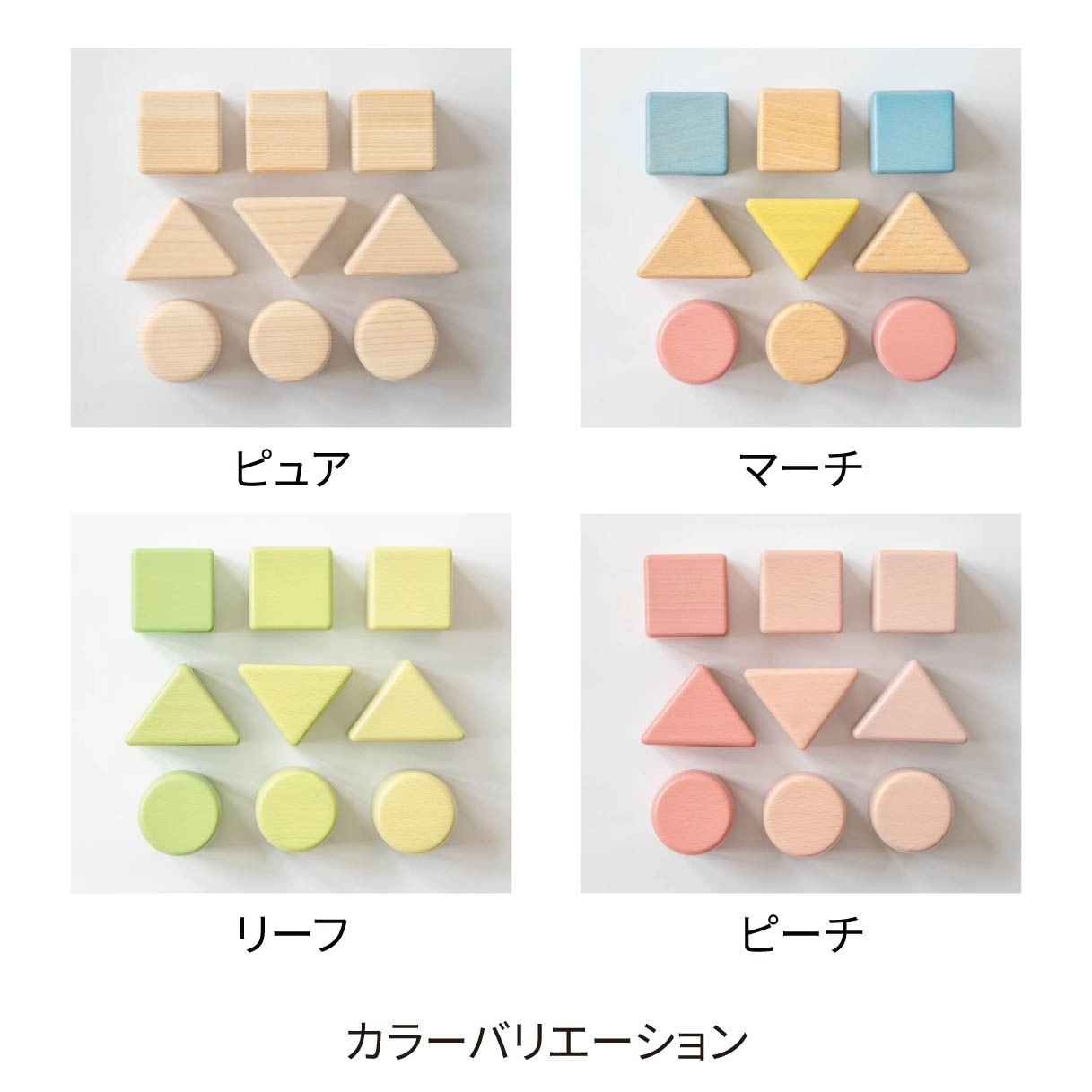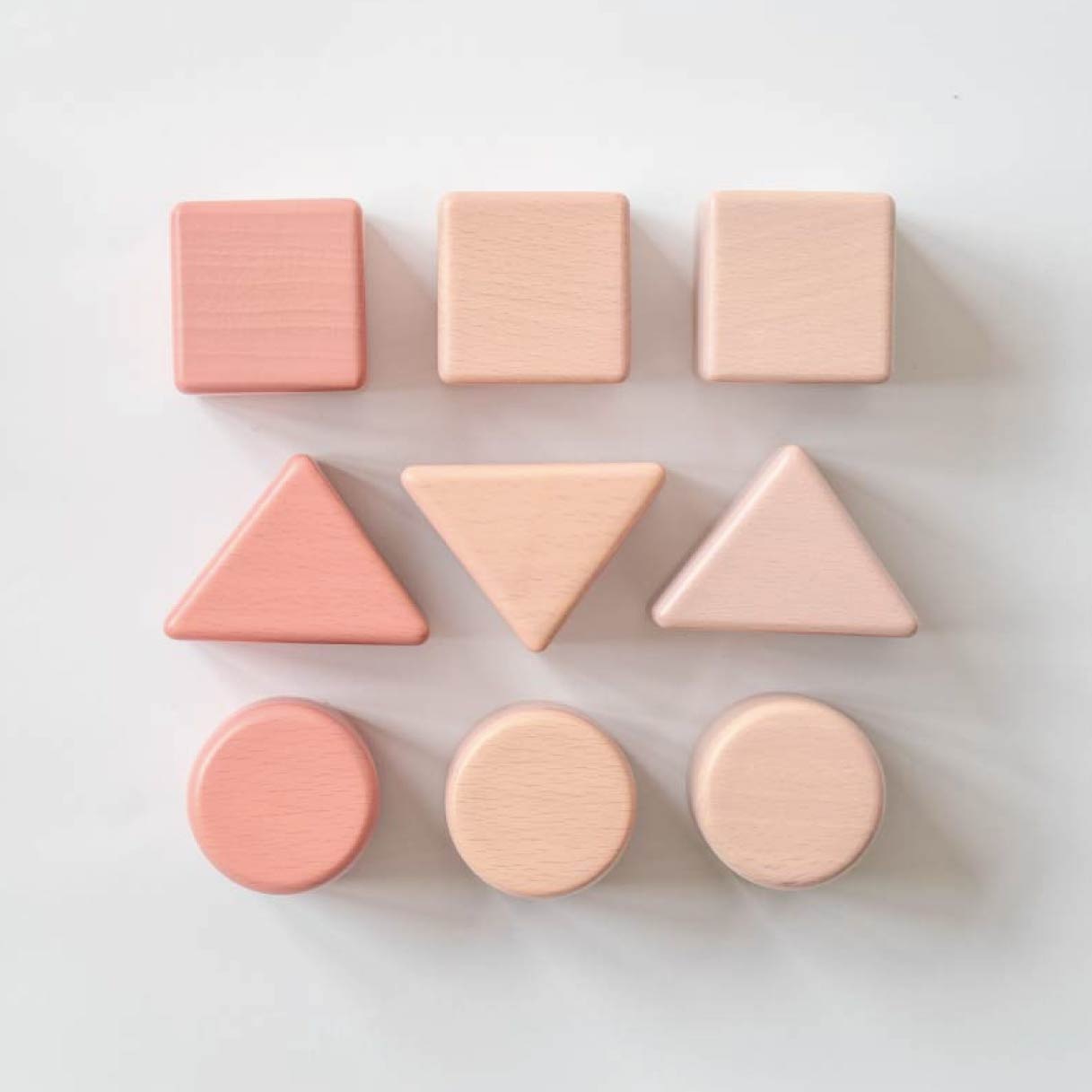 赤ちゃんの手になじむ、優しい手触りの基本の木製積み木です。桃をイメージした甘くて明るいピンクグラデーションカラーのセットです。