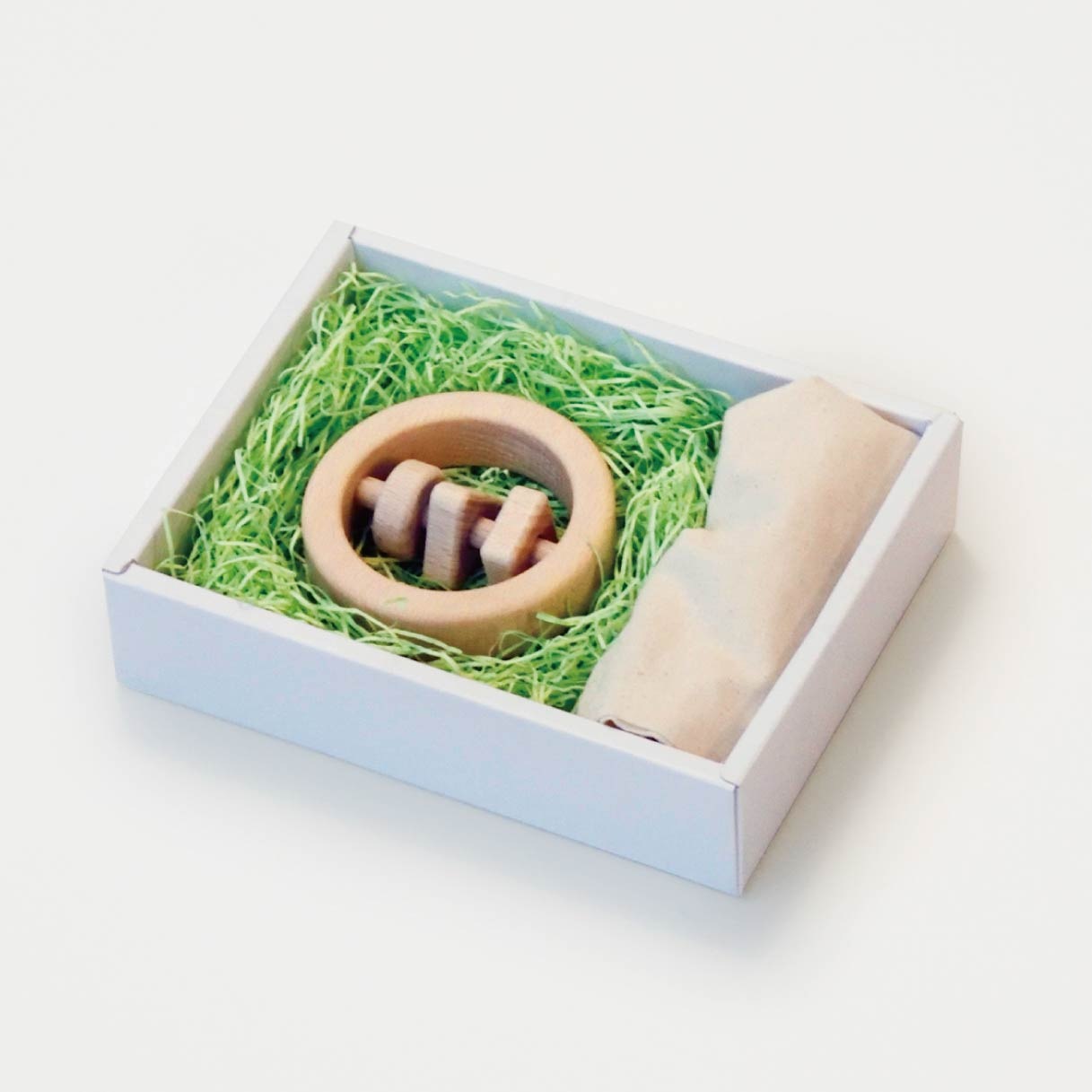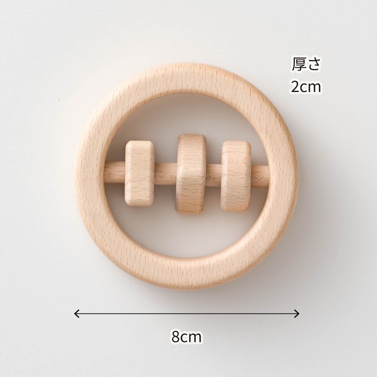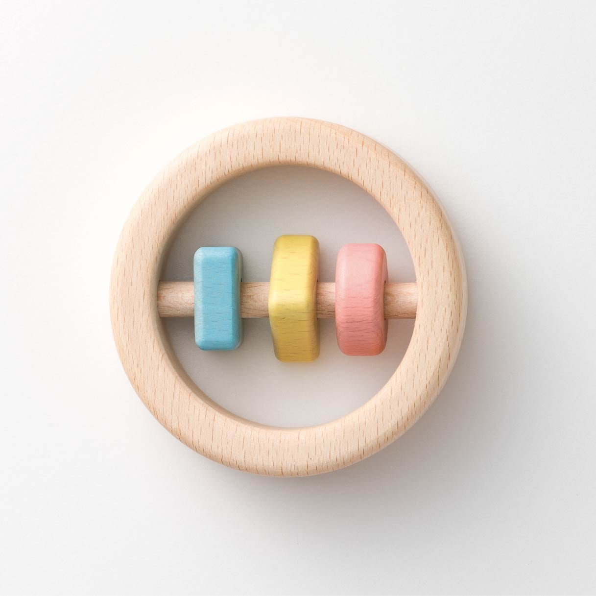 天然木を使用した、優しい手触りの無塗装仕上げの木製ラトル。赤ちゃんの手にぴったりサイズなガラガラおもちゃで、出産祝いにも選ばれています。