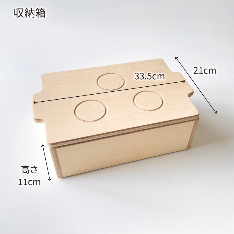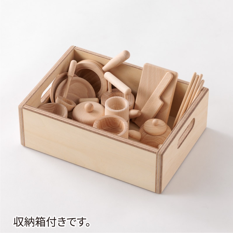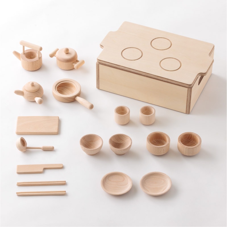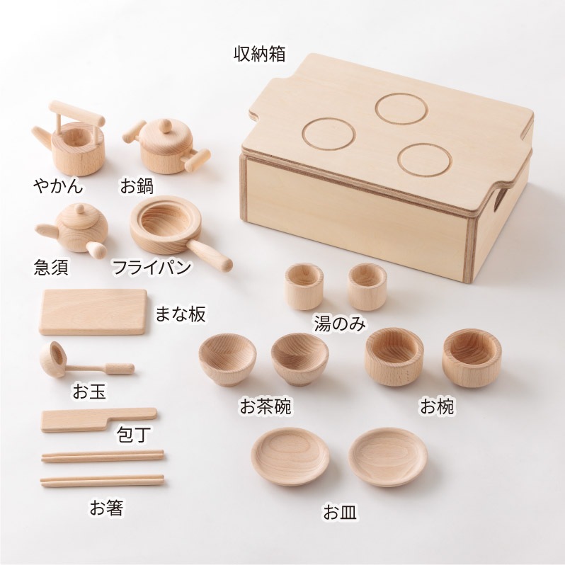やかん、鍋、包丁、食器などがそろった、無塗装の天然木ままごとセット。子どもの手のひらに収まるサイズ、木のぬくもりが感じられるやさしいデザインで、3歳からのごっこ遊びに最適。収納箱はコンロとしても使える2WAY仕様で、片づけまで楽しく学べます。