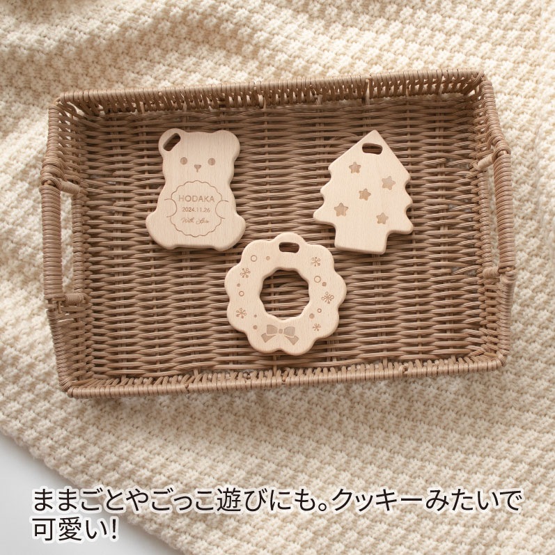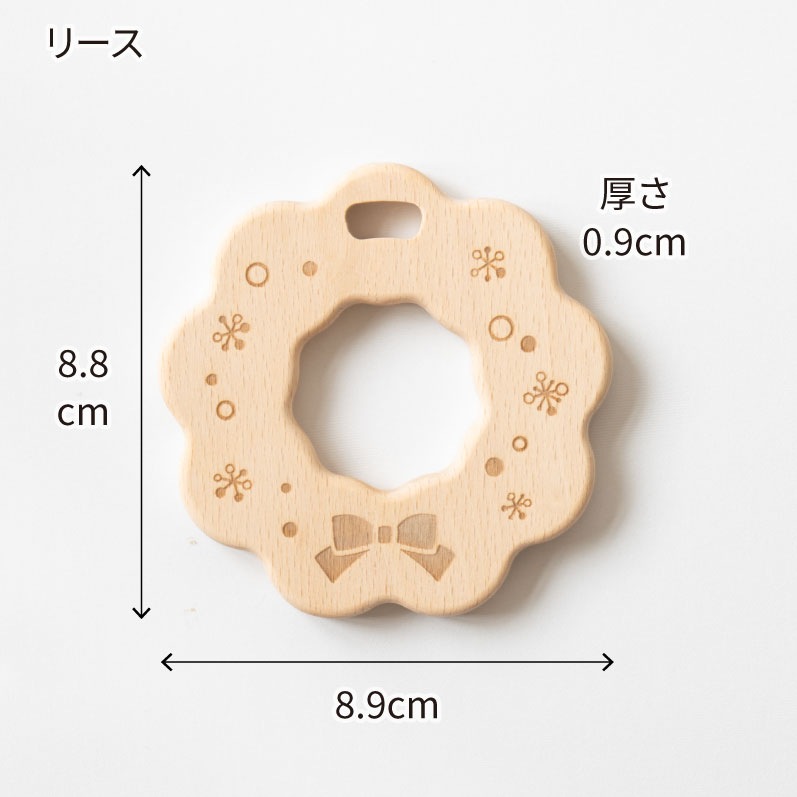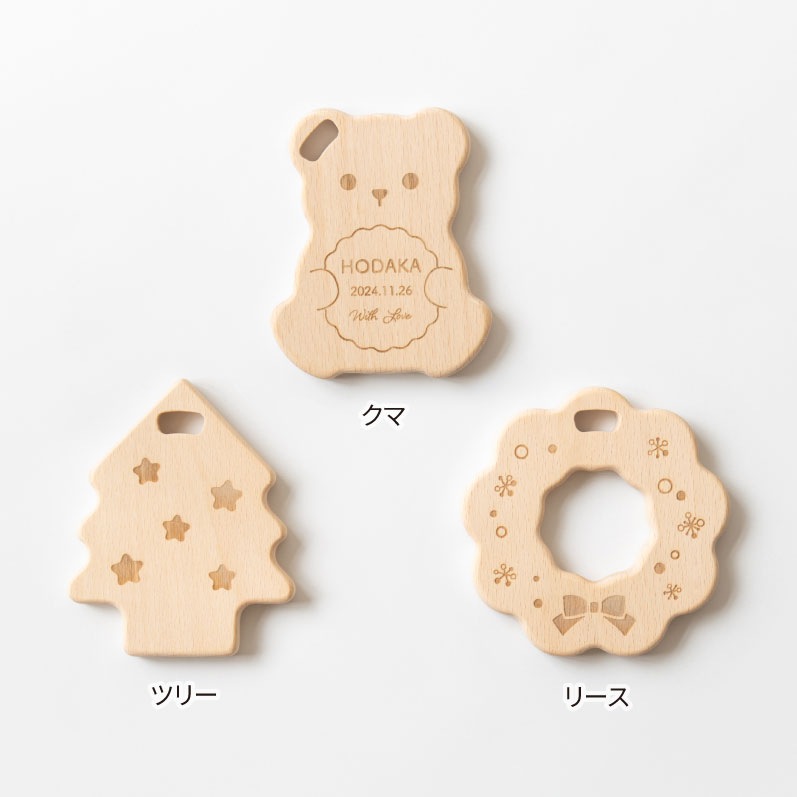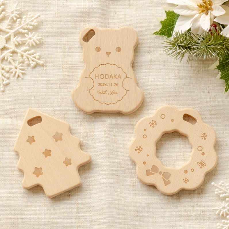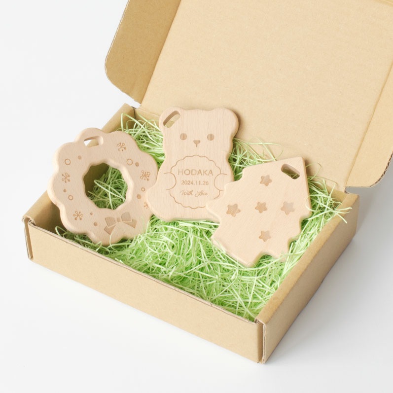 天然木のやさしい手触りがうれしい、クリスマスの歯固めセットです。3種類セットで、見た目もかわいくギフトや記念撮影にもおすすめです。