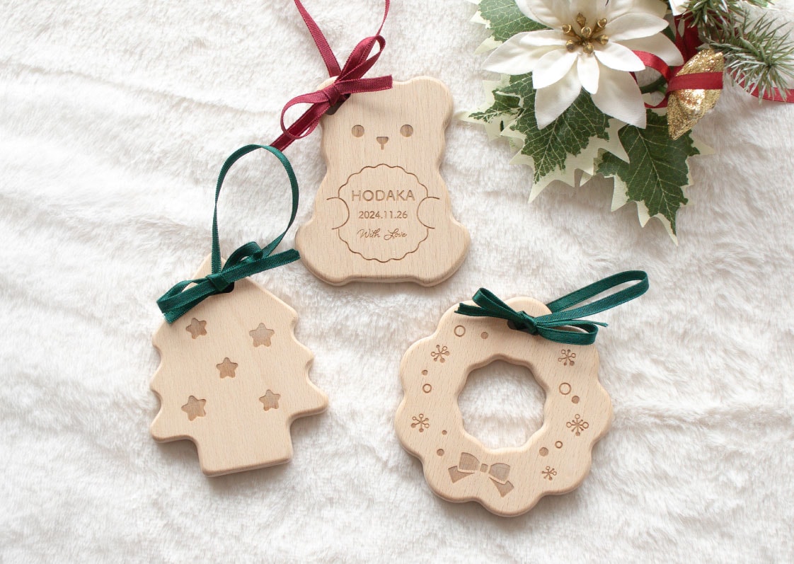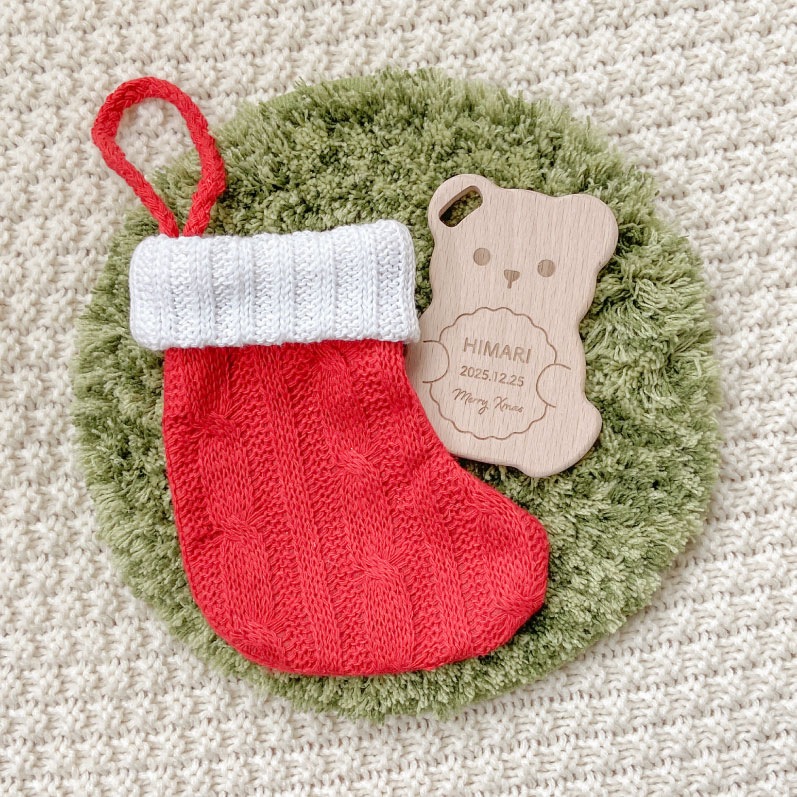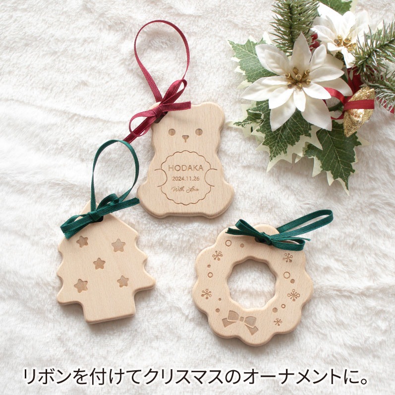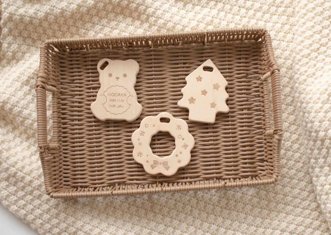 天然木のやさしい手触りがうれしい、クリスマスの歯固めセットです。3種類セットで、見た目もかわいくギフトや記念撮影にもおすすめです。