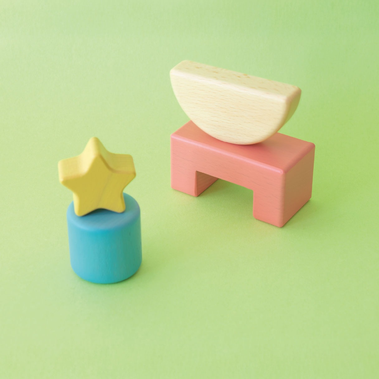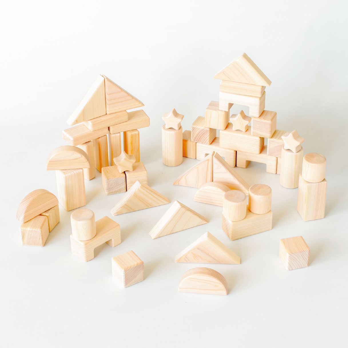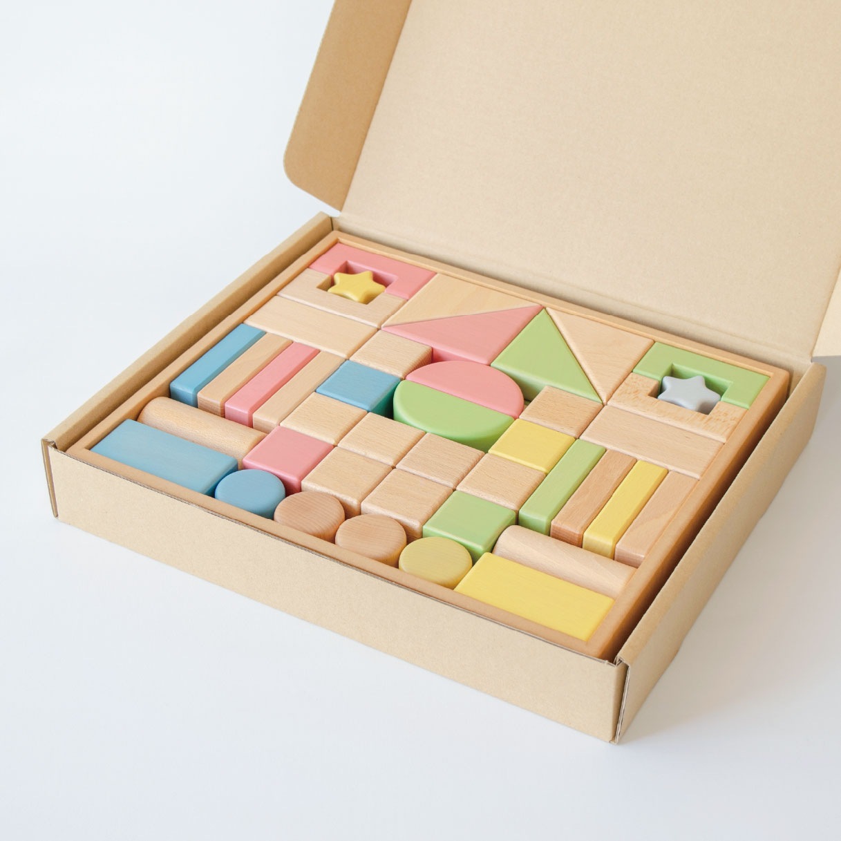 ナチュラルな木目と、明るく優しいカラフルな積み木セットです。基本の丸三角四角の他に、星型や橋などバリエーション豊かな50ピース入り。ギフトにもぴったりです。